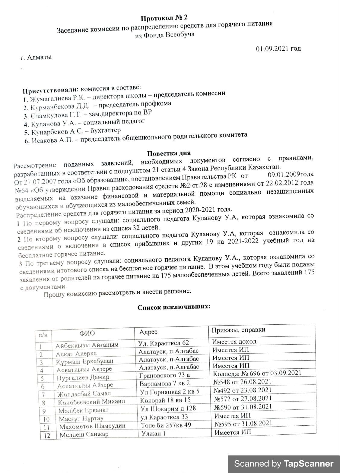 01 қыркүйек 2021 0 1 2 3 4 5 Протокол № 2 "Заседание комиссии по распределению средств для горячего питания из Фонда Всеобуча"