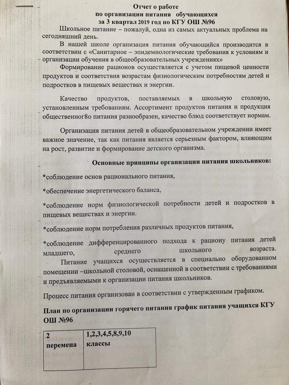 Отчет о работе по организации питания за 2017 год по КГУ ОШ№96