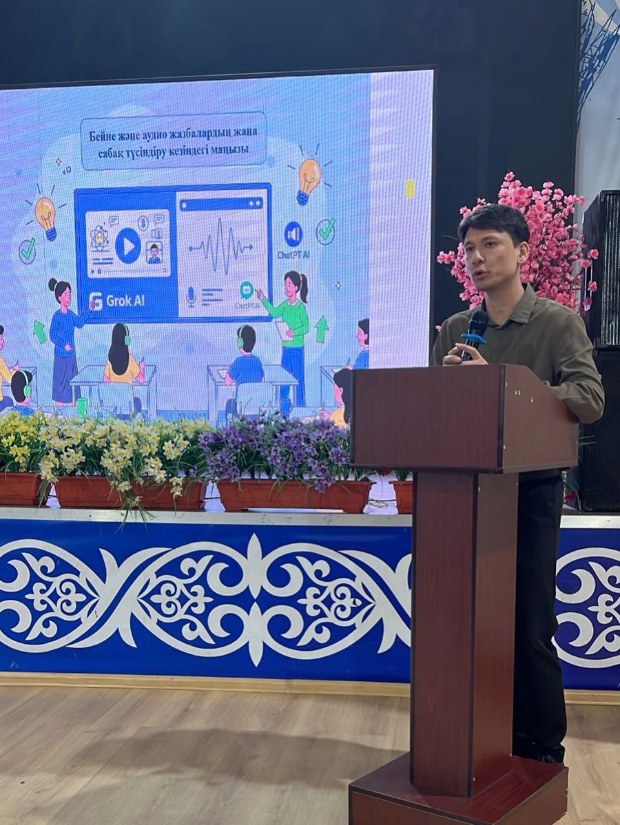 Қамбар Ғазизұлы Grok AI платформасының мүмкіндіктерін таныстырып, нейрожелінің құрылымды конспект жасау, күрделі сұрақтарға жауап беру және сабаққа креативті идеялар ұсынудағы тиімділігін көрсетті.