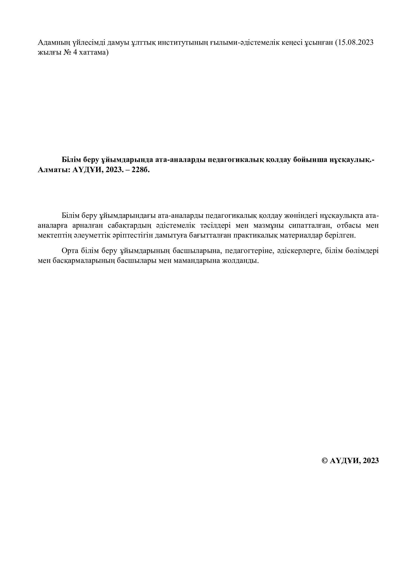 01 қыркүйек 2023 0 1 2 3 4 5 Ата-аналарды педагогикалық қолдау бойынша сабақтар өткізу жөніндегі нұсқаулық.