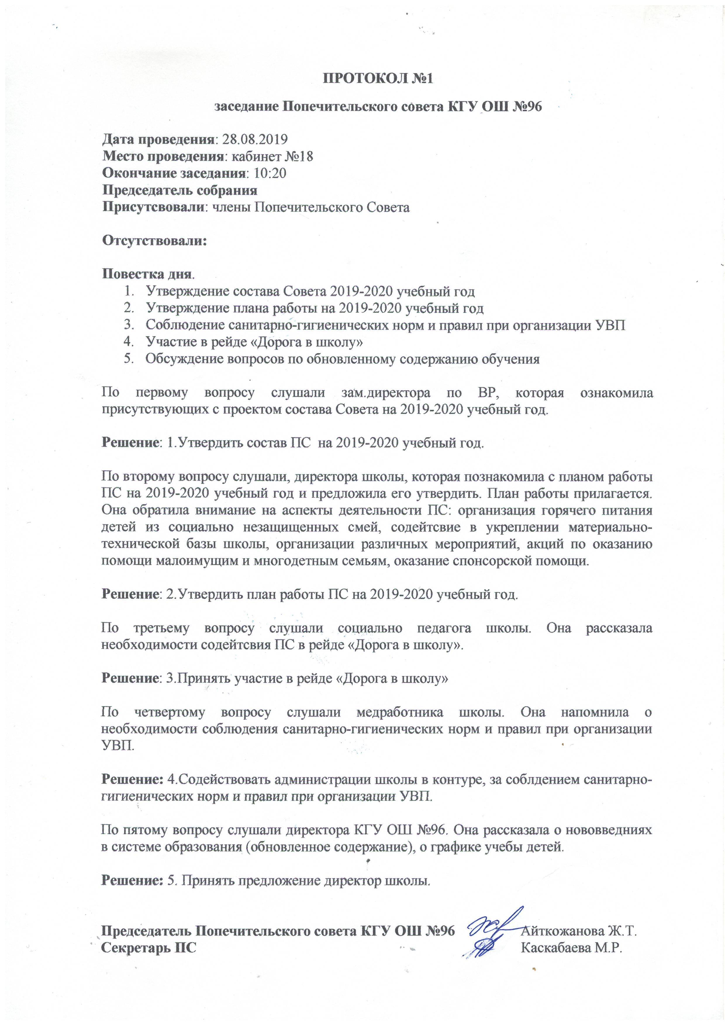Протокол №1 Попечительского совета КГУ ОШ №96