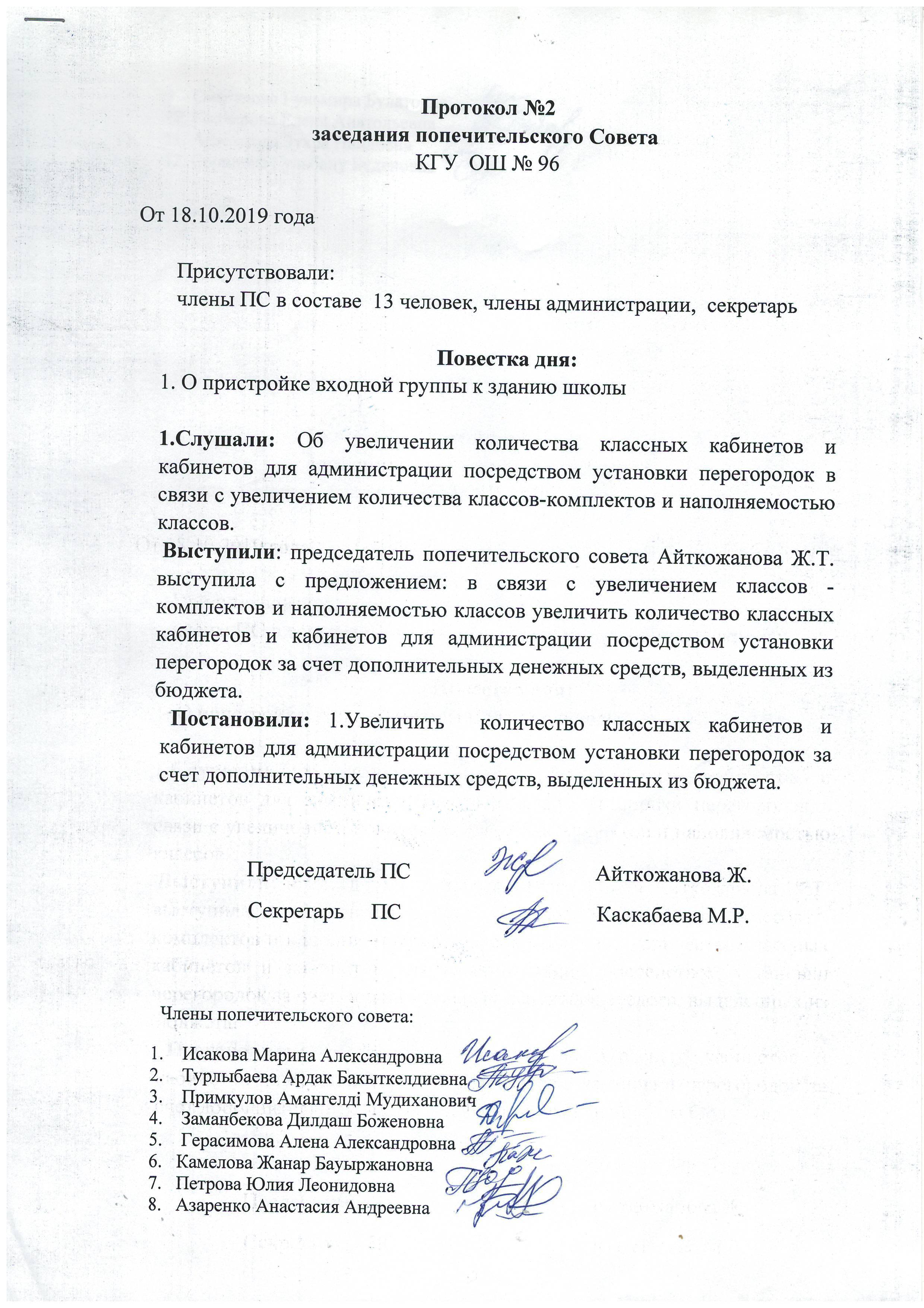 Протокол № 2 заседание Попечительского совета КГУ ОШ№ 96