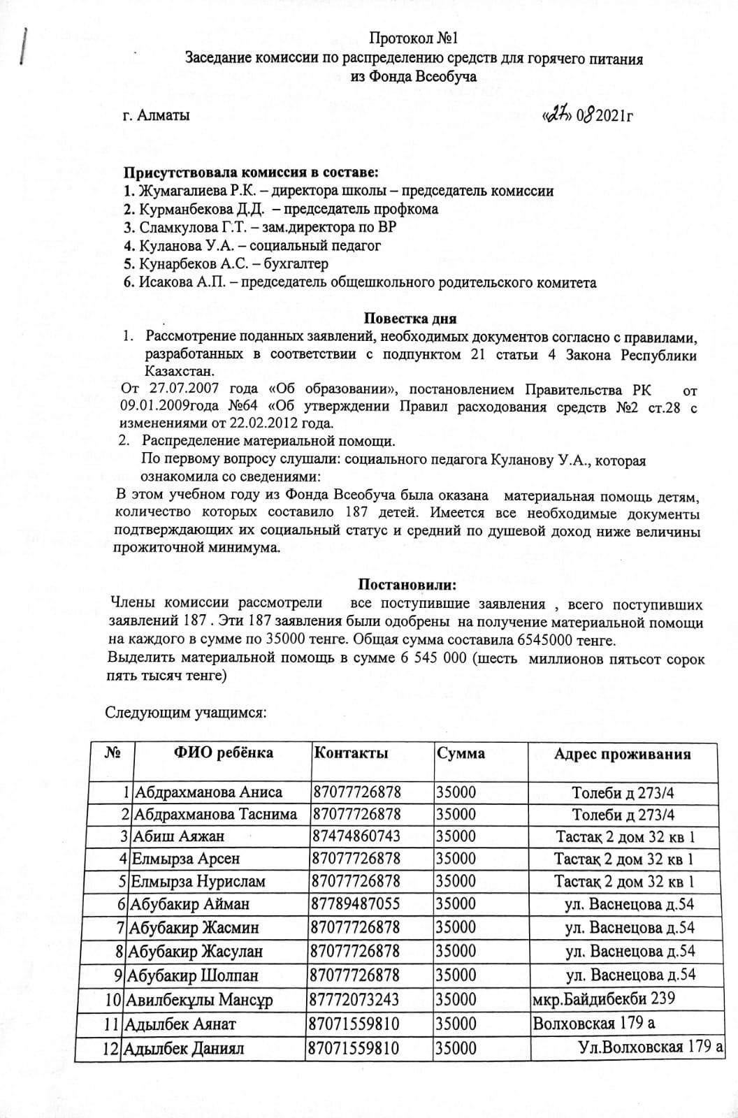 27 тамыз 2021 0 1 2 3 4 5 Протокол №1 Заседание комиссии по распределению средств для горячего питания из ФОНДА Всеобуча