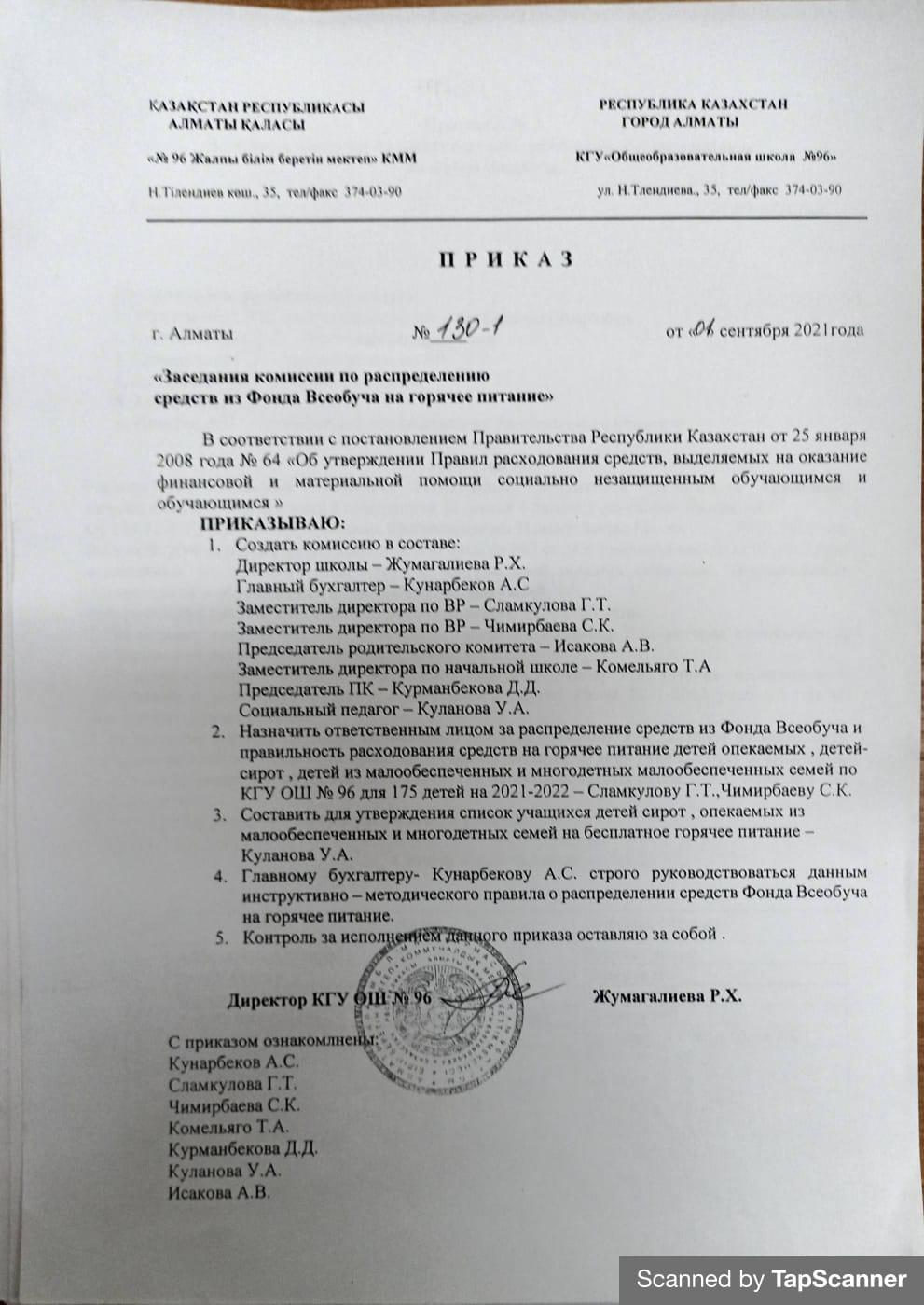 01 қыркүйек 2021 0 1 2 3 4 5 Приказ №130-1 "Заседания комиссии по распределению средств из Фонда Всеобуча на горячее питание"