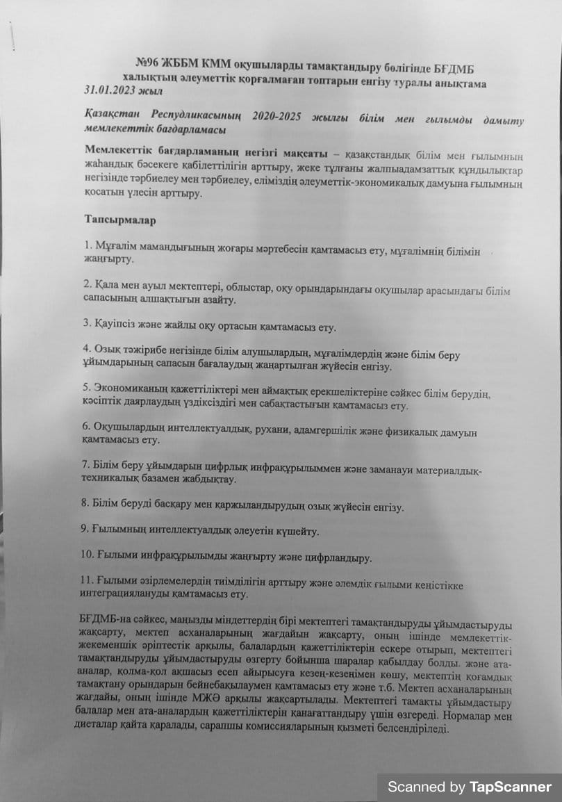 31 қаңтар 2023 0 1 2 3 4 5 №96 ЖББМ КММ оқушыларды тамақтандыру бөлігінде БҒДМБ халықтың әлеуметтік қорғалмаған топтарын енгізу туралы анықтама 31.01.2023 жыл