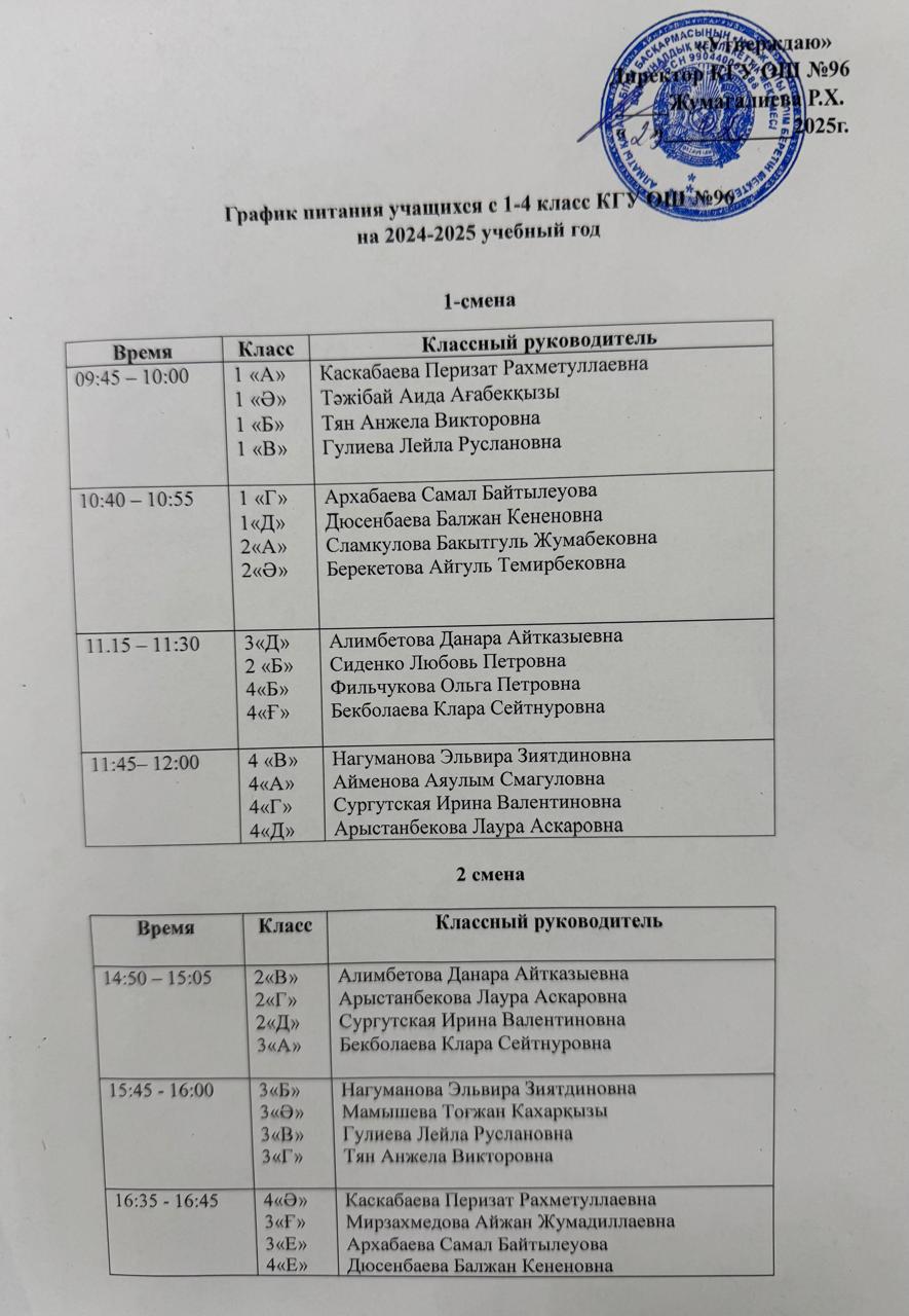 График питания учащихся с 1-4 класс КГУ ОШ №96 на 2024-2025 учебный год