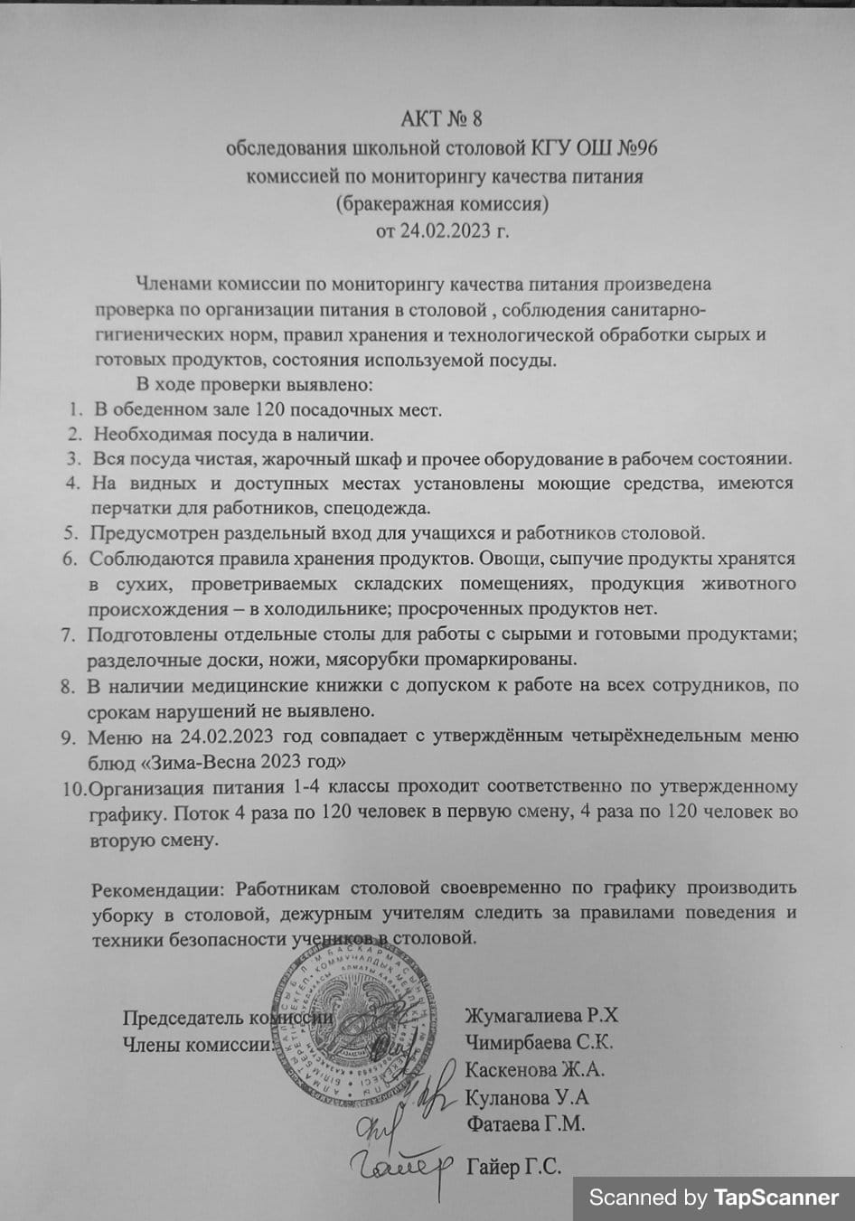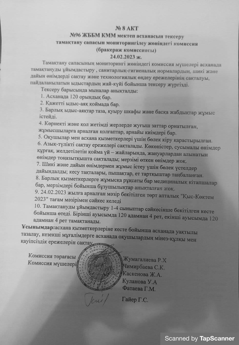 24 ақпан 2023 0 1 2 3 4 5 №96 ЖББМ КММ мектеп асханасы тексеру тамақтану сапасын мониторингілеу жөніндегі комиссия (бракераж комиссиясы)АКТ №8 обследования школьной столовой КГУ ОШ№96 комиссией по мониторингу качества питания