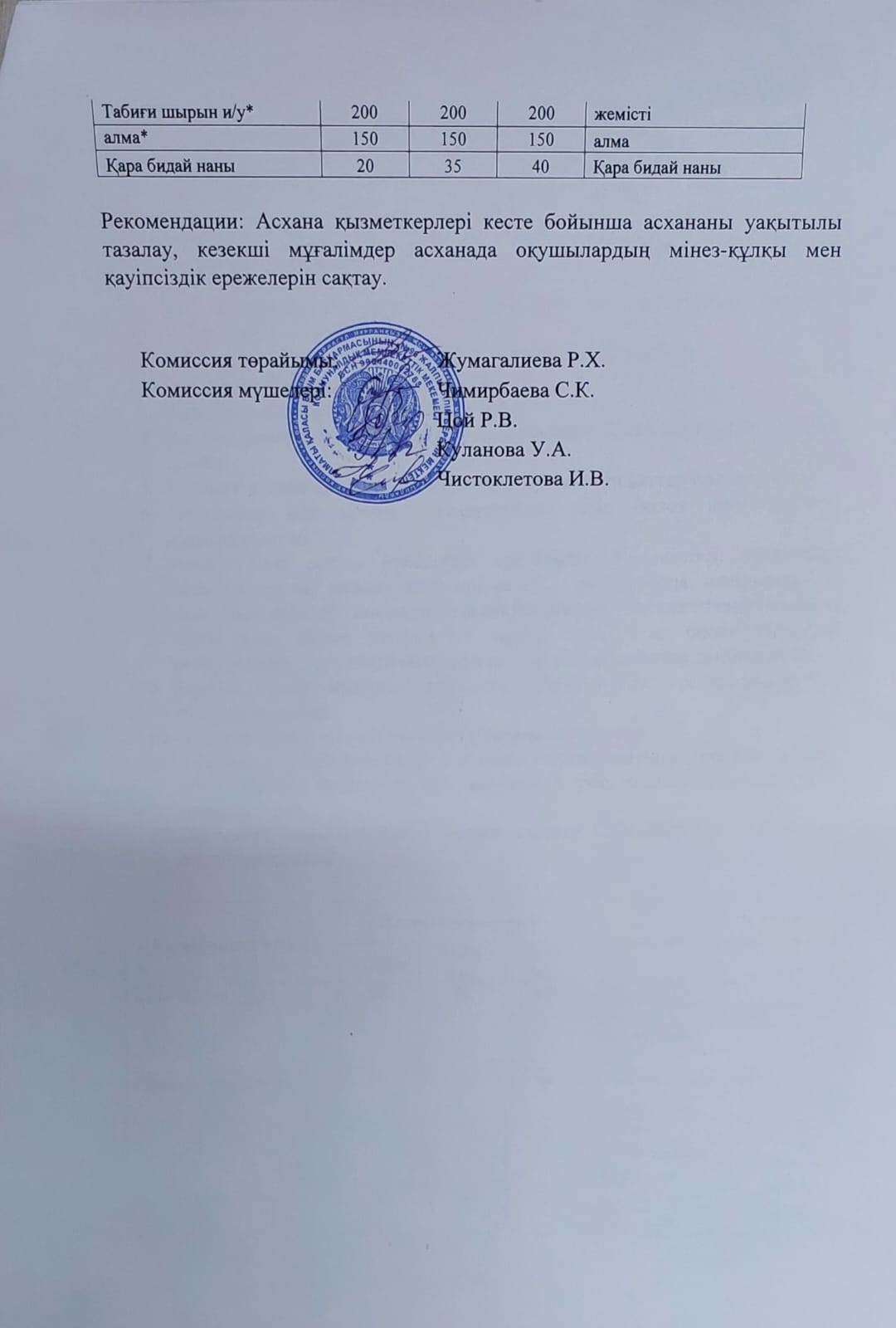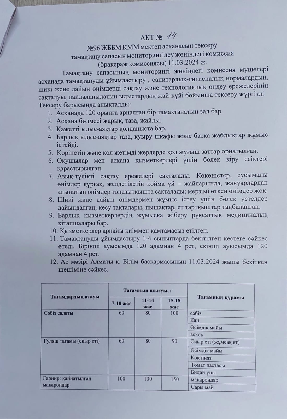 11 наурыз 2024 0 1 2 3 4 5 АКТ №14ЖББМ КММ мектеп асханасын тексеру тамақтану сапасын мониторингілеу жөніндегі комиссиясы / обследования школьной столовой КГУ ОШ№96 комиссией по мониторингу качества питания (бракеражная комиссия)