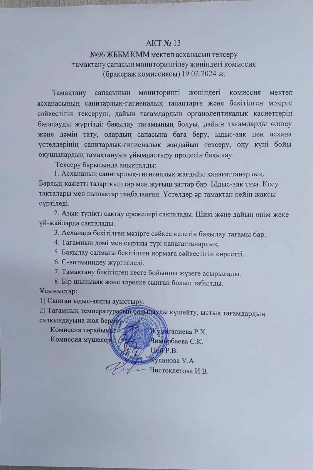 19 ақпан 2024 0 1 2 3 4 5 АКТ №13 ЖББМ КММ мектеп асханасын тексеру тамақтану сапасын мониторингілеу жөніндегі комиссиясы/ обследования школьной столовой КГУ ОШ №96 комисиией по мониторингу качества питания (бракеражная комиссия)