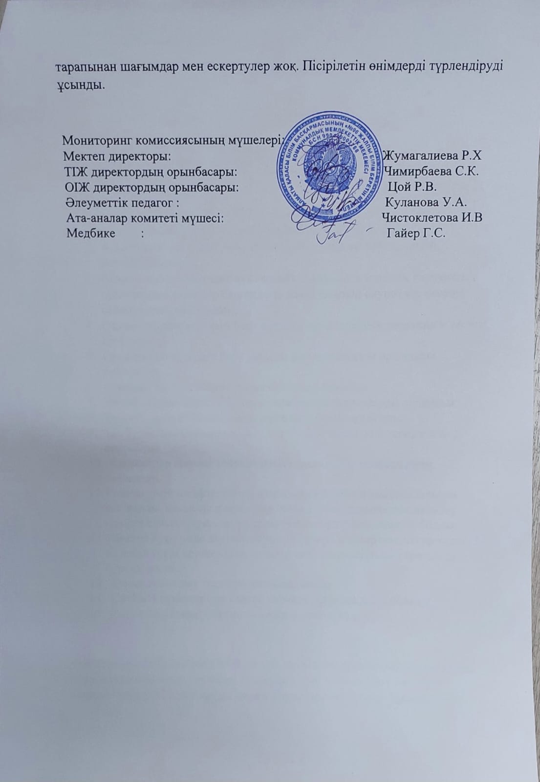 » АКТ№8 бақылау және тамақтану сапасы жөніндегі мониторингтін комиссиясы