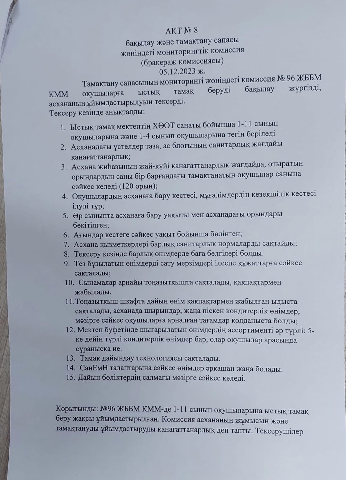 №96 ЖББМ КММ мектеп асханасы тексеру тамақтану сапасын мониторингілеу жөніндегі комиссия (бракераж комиссиясы)АКТ №8 обследования школьной столовой КГУ ОШ№96 комиссией по мониторингу качества питания