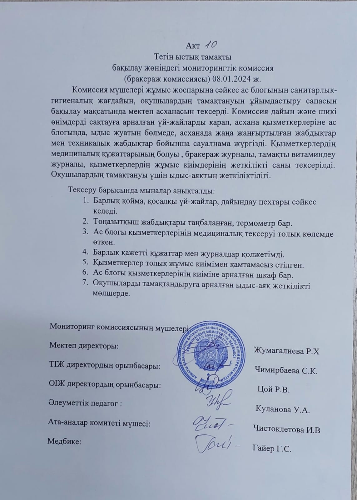 АКТ №10 Тегін ыстық тамақты бақылау жөніндегі мониторингтік комиссиясы