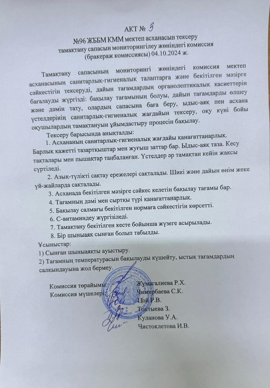04 қазан 2024 0 1 2 3 4 5 АКТ №3 мектеп асханасын тексеру тамақтану сапасын мониторингілеу жөніндегі комиссия (бракераж комиссиясы)