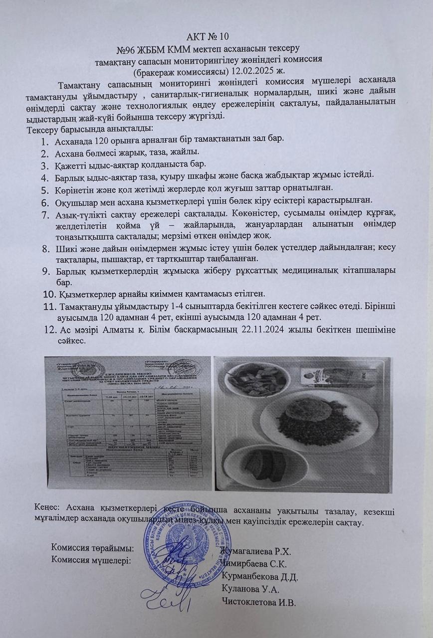 12 ақпан 2025 0 1 2 3 4 5 АКТ № 10 №96 ЖББМ КММ мектеп асханасын тексеру тамақтану сапасын мониторингілеу жөніндегі комиссия