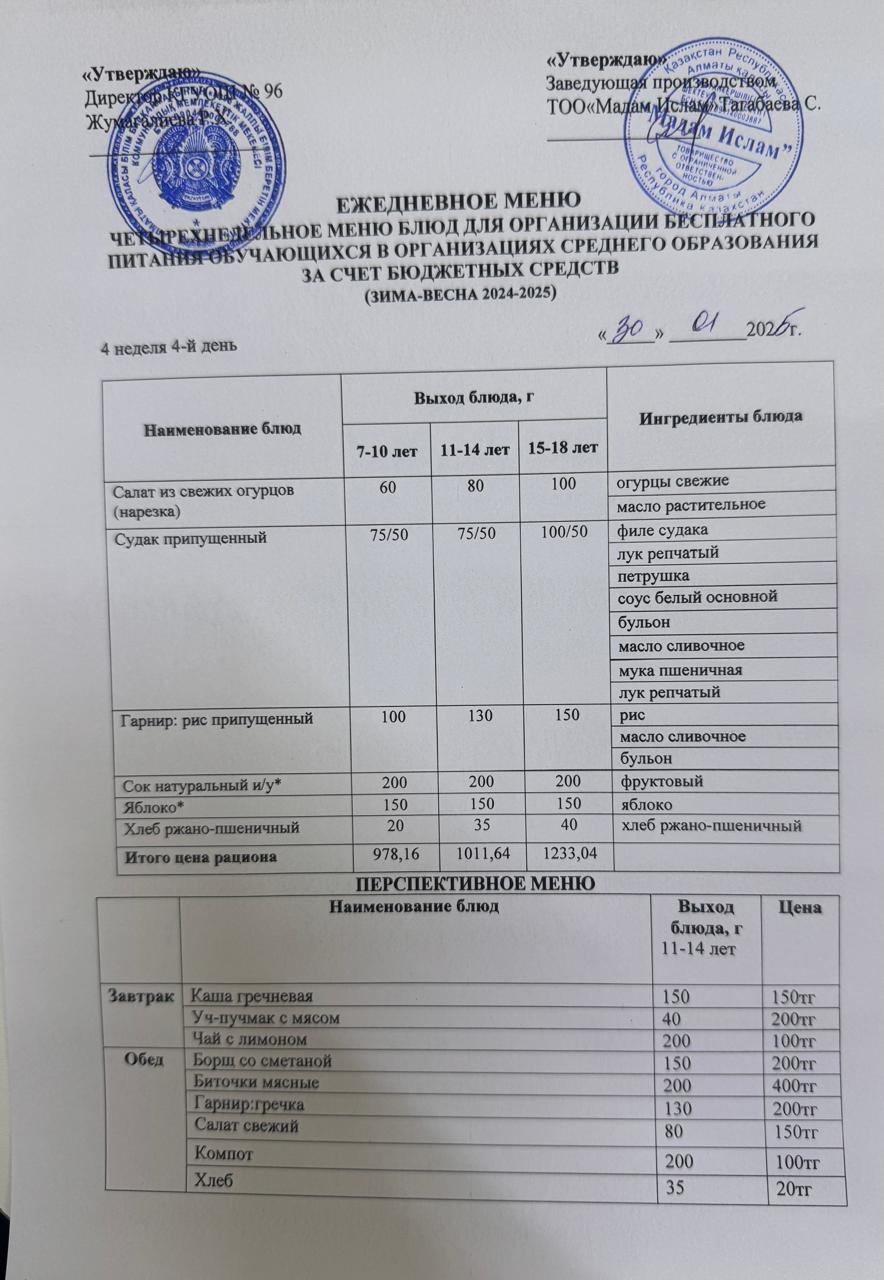 График дежурство учителей по столовой КГУ ОШ № 96 на 2024-2025 учебный год. 1-смена 08:00-13:00