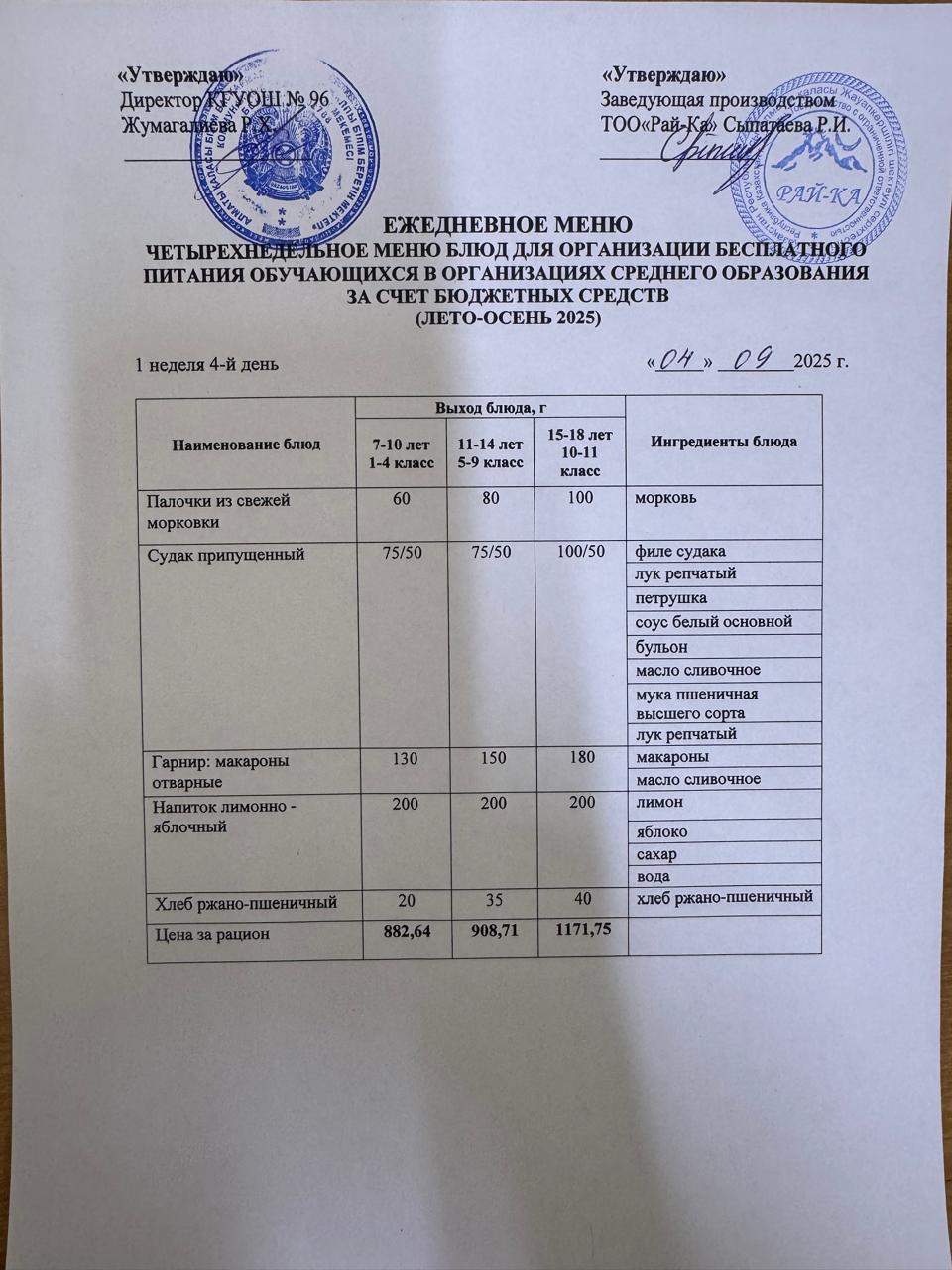 Ас мәзірі/Меню 04.09.2025