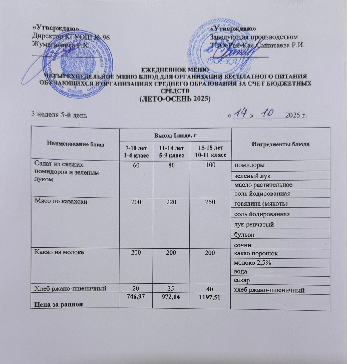 Ас мәзірі/Меню 17.10.2025