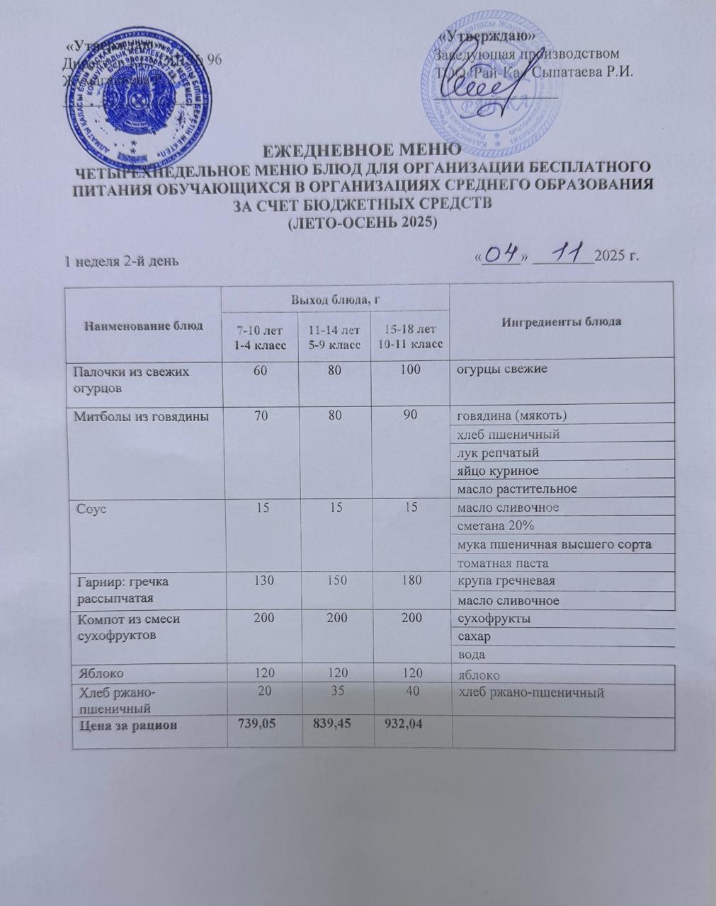 Ас мәзірі/Меню 04.11.2025