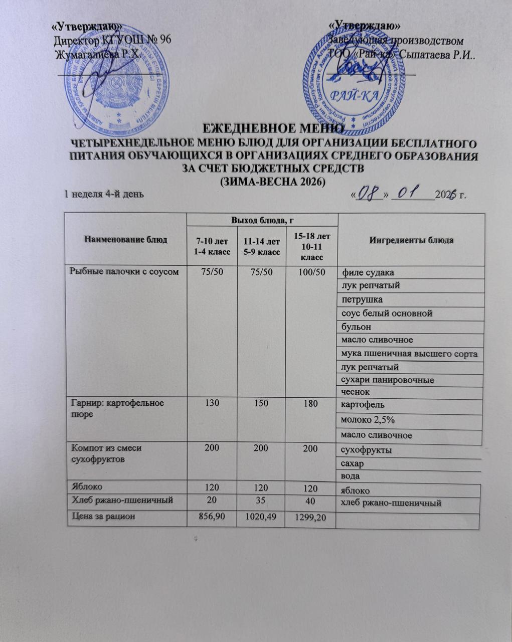 Ас мәзірі/Меню 08.01.2026