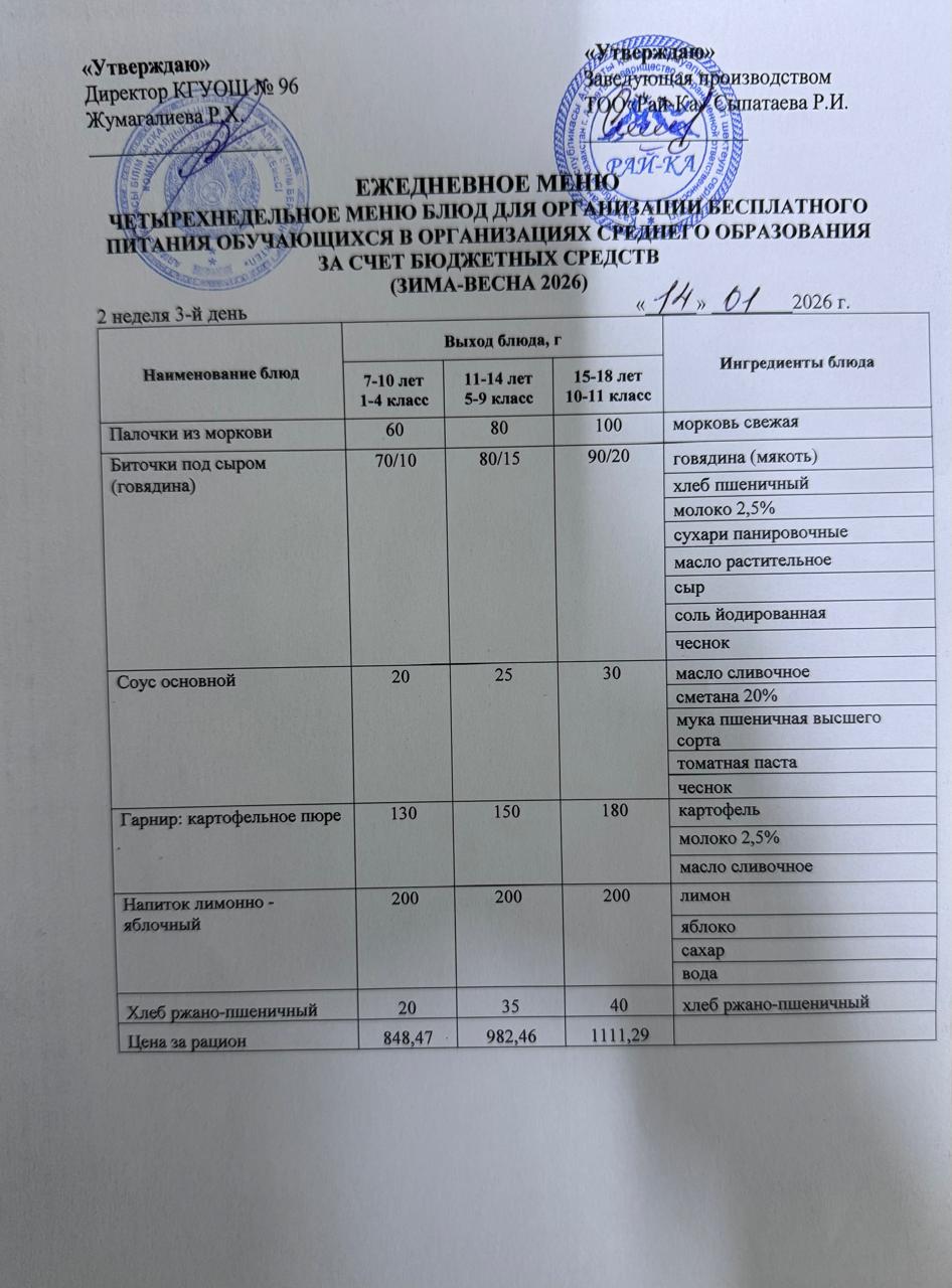» Ас мәзірі/Меню 14.01.2026