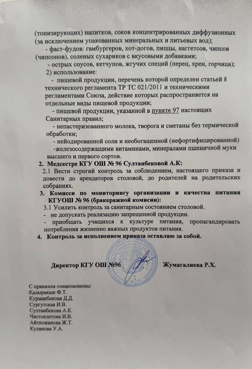 Приказ КГУ ОШ№96 "О запрете реализации отдельных видов продуктов питания"
