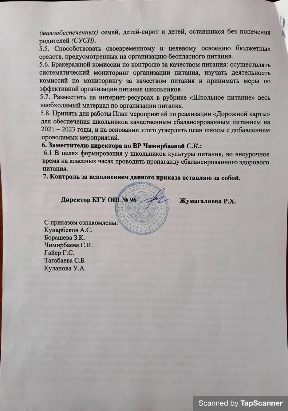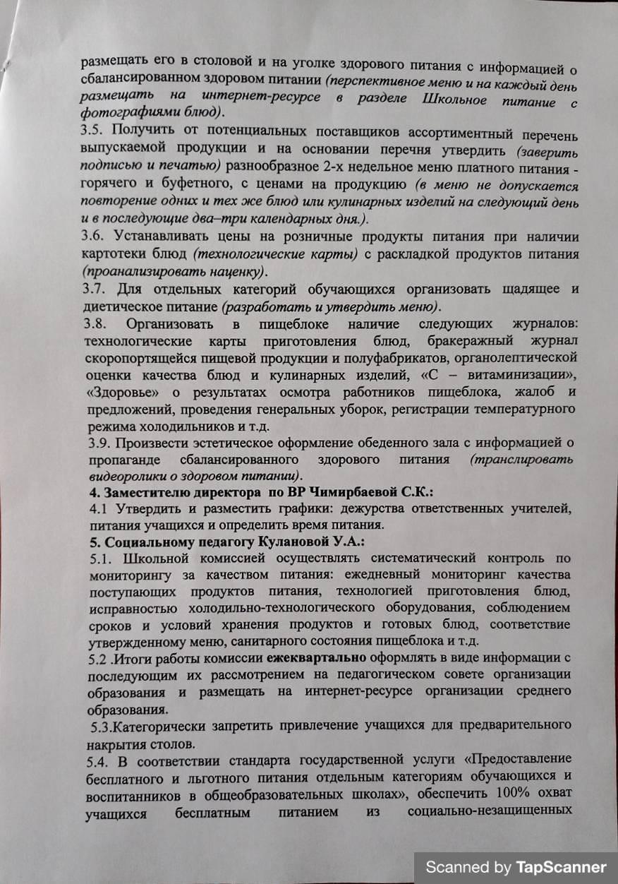 Приказ по КГУ ОШ№96 "Об организации питания учащихся 1-11 классов и бесплатного питания для учащихся из социально-незащищенных (малообеспеченных) семей, детей-сирот и детей, оставшихся без попечения родителей (СУСН) за счет средств фонда Всеобуча "